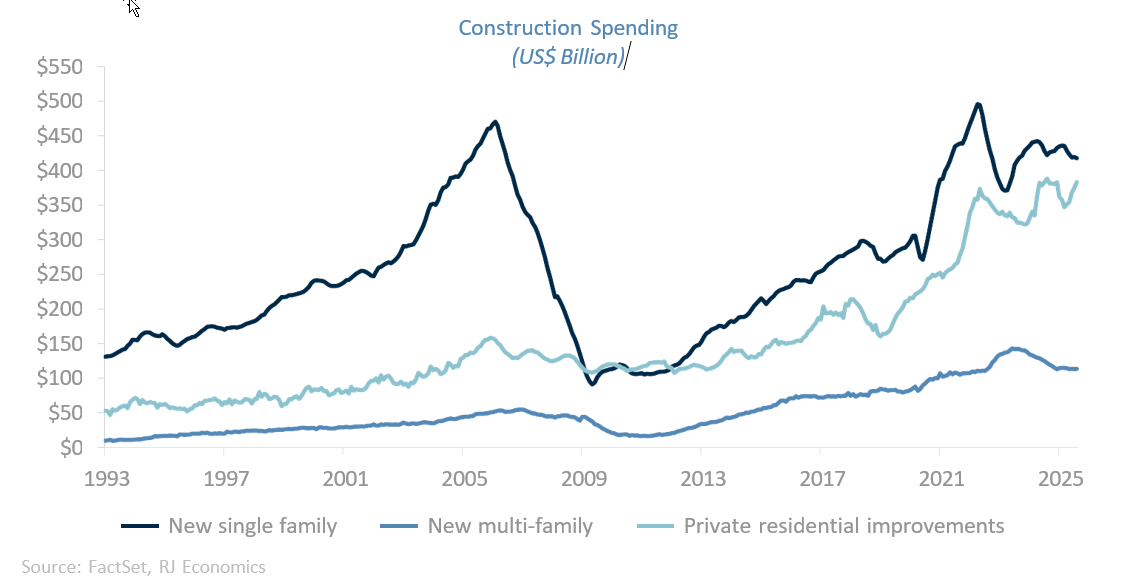 This private residential improvements component is different from the retail sector’s building materials and garden supply stores, which includes the do-it-yourself component for home renovations. The latter is part of consumption expenditures rather than the investment component of GDP, as is the case for the private residential improvement sector. However, the correlation between these two sectors (private residential improvements and building materials and garden supply) is about 95%.